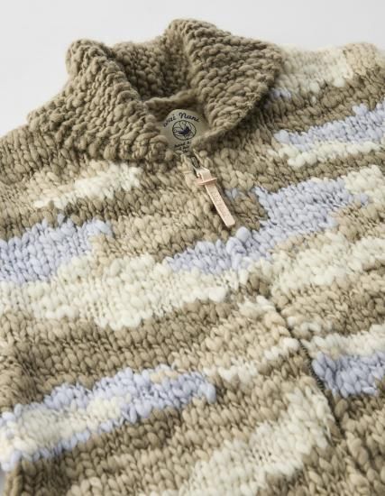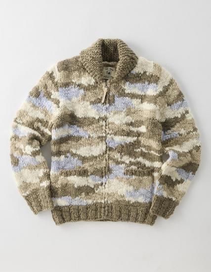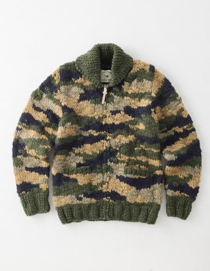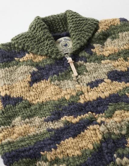 WAINANIメリノウールカウチンセーター、その名に違わず、軽さと暖かさを兼ね備えた一枚です。むら糸ウールを贅沢に使用し、手作りで仕上げられたこのセーターは、カモフラージュ柄が施されており、一枚で存在感のあるスタイリングを演出します。